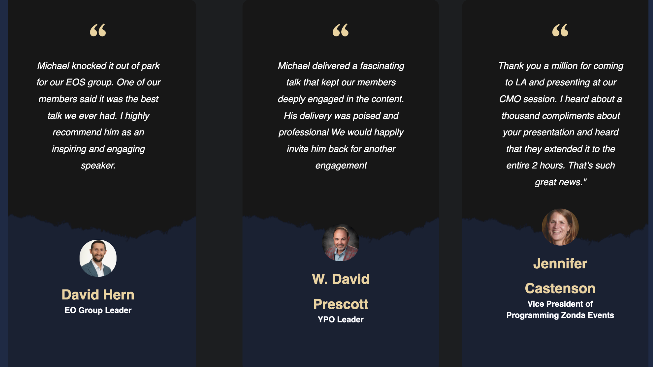Michael's full speaker kit includes his bio suite, signature talks, testimonials, and booking information — formatted for event programs, speaker bureau submissions, and internal review.